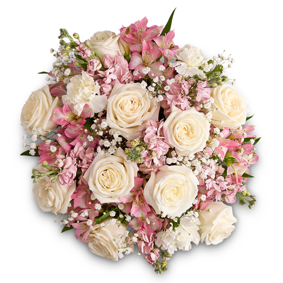 Our elegant bouquet in shades of blush pink and creamy white brings all the charm of a rustic country garden to the people you care about. Cascading blooms are hand-gathered with lush greenery and designed in a clear cylinder vase, creating a beautiful gift that delights with every detail. • All-around arrangement with white roses and carnations, pink Peruvian lilies (alstroemeria) and stock; accented with baby’s breath and assorted greenery • Extra large arrangement measures approximately 16""H x 14""W • Large arrangement measures approximately 15""H x 13""W • Medium arrangement measures approximately 13""H x 12""W • Small arrangement measures approximately 12""H x 11""W • Artistically designed a clear glass cylinder vase; large vase measures 6""H; medium/small vase measures 5""H • Our florists hand-design each arrangement, so colors and varieties may vary due to local availability • To ensure lasting beauty, lilies arrive in bud form, ready to bloom in a few days"